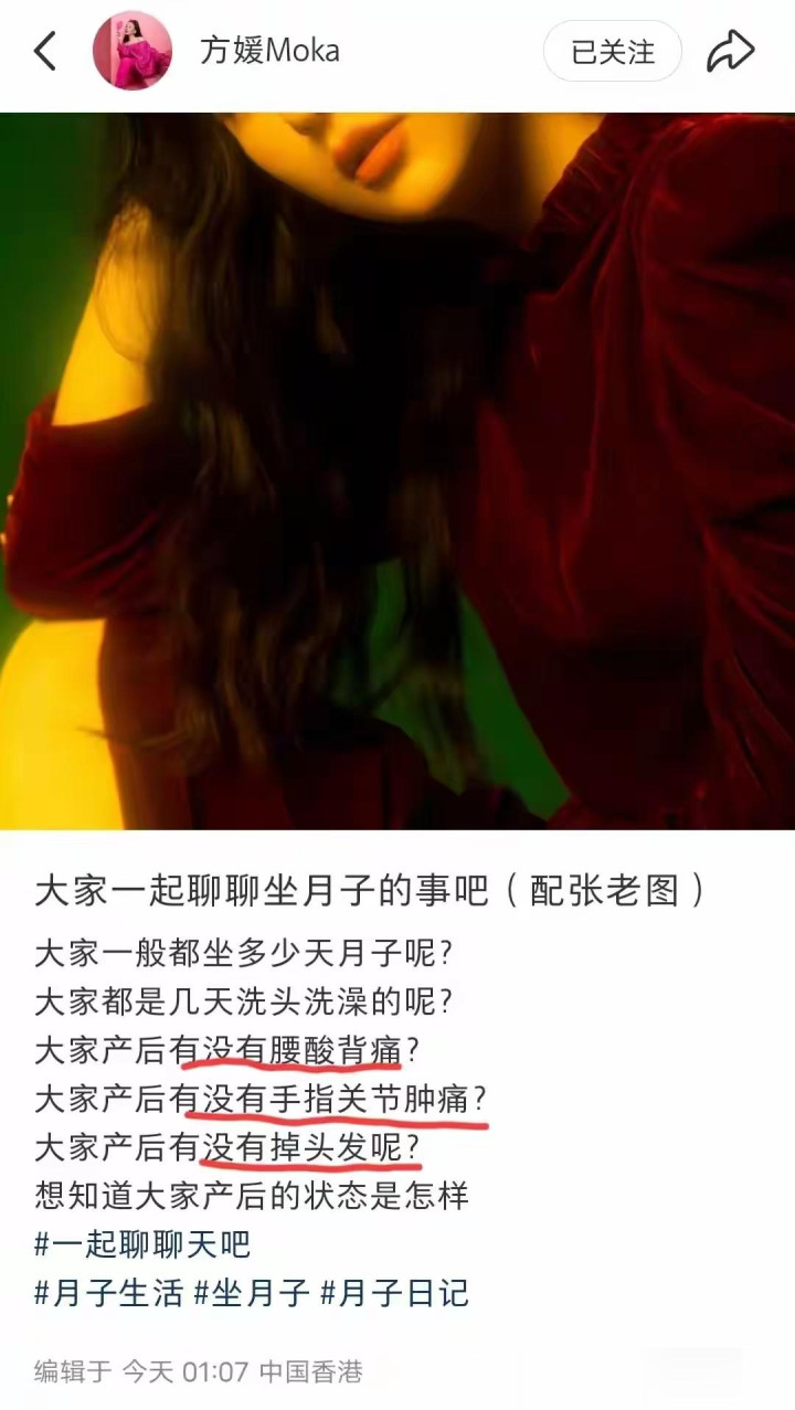 没想到生娃不到一个月,方媛就在深夜问起了网友,坐月子有的状况。
